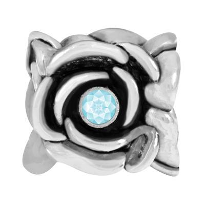 11x10mm 4 flowers with aquamarine rhinestones rhodium plated large hole bead. Great for March birthdays! Excellent quality and value. Our enhanced rhodium plating process creates an exceptional finish and increases durability. This large hole bead has a big 5mm hole and is compatible with all the major name brands of create your own jewelry as well as a wide variety of stringing materials, including our very own add-a-bead bracelets and bangles!