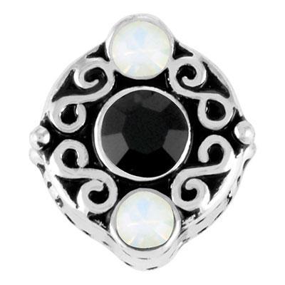 10x10mm jet and opal stones lillian slider charm. These slide charms work with 1 strand of 5mm flat leather or 2 strands of 2mm round leather. Mix and match to create easy and stylish bracelets! Rhodium plated.