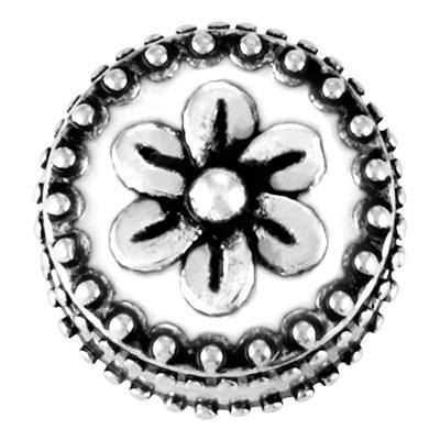 11x11mm white enamel graceful slider charm. These slide charms work with 1 strand of 5mm flat leather or 2 strands of 2mm round leather. Mix and match to create easy and stylish bracelets! Rhodium plated.
