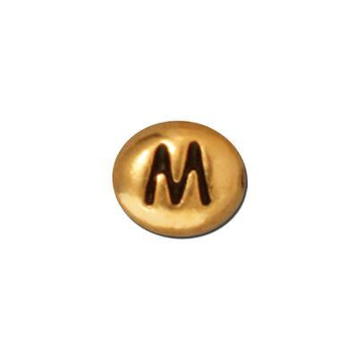 7x6mm oval pewter alphabet beads with a fabulous antique gold plating. Letter M. A wonderful shape to use in any name bracelets. Horizontal hole.