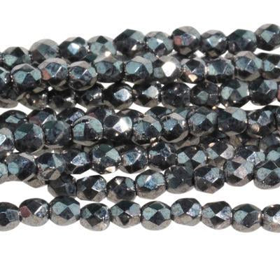 3mm Hematite Czech Glass Fire Polish Beads. The area now known as the Czech Republic has been a leader in the glass industry since the Middle Ages. Factories in the Czech Republic continue to produce the highest-quality and most innovative glass beads. Czech Glass can be easily distinguished from lower quality glass produced elsewhere. This difference is most easily observed in the consistency, quality and variety of color and finish, as well as the consistency and quality of cut and shape. The faceted round beads commonly known as "Fire Polish" are machine cut and then slightly melted to create smoother edges. Lead Free. Approximately 50 beads per strand.